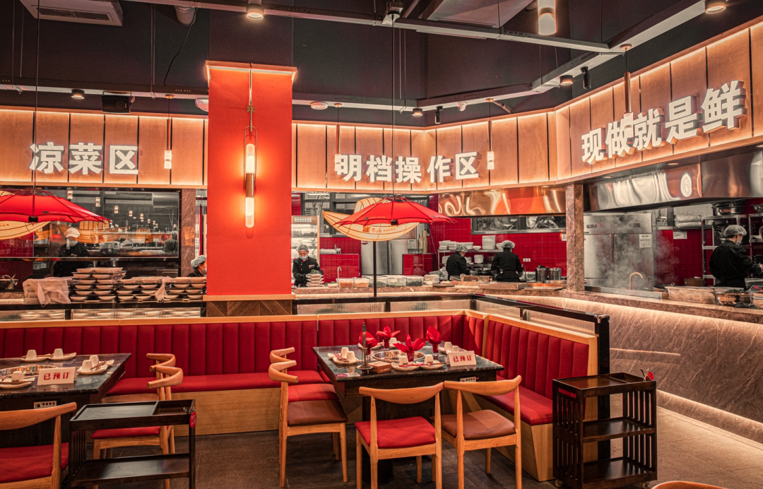 明档厨房、鲜鱼坊、凉菜区、精酿啤酒区等模块既独立又联动,既保证了操作流程的专业化,又将食材处理、锅底炒制、饮品调配等过程转化为一场“沉浸式餐饮剧场”。