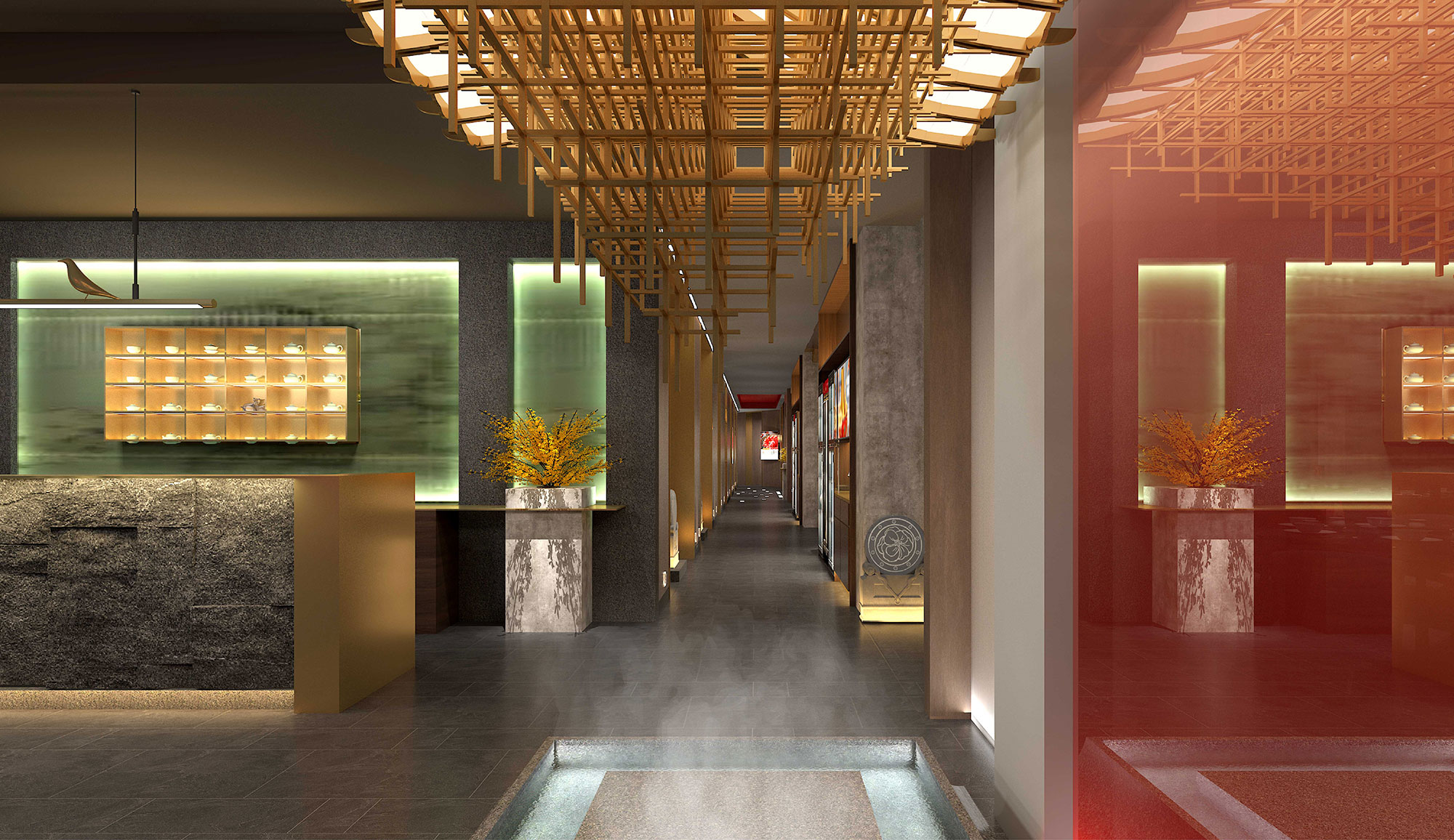 店面位于北京市朝阳区北四环北苑路,项目整体外立面大胆的大面积采用红色漆及铜色金属网格栅,结合了在地性响应了北京古都的特色,氛围营造包容和热情的感受。主入口处玻璃砖墙的作为新材料突显年轻时尚的特点,很好的中和了红的热烈和张扬。传统铜质碳火锅造型突出了北方火锅的产品特点,也同时放大品牌记忆。入口处一尊火锅延续外门头的视觉特色,运用红色门片和绿色琉璃瓦色背景,让用餐者再一次强化对北京城的印象。做旧的水泥漆、青石板与现代感的夹绢玻璃、金属板相互交替融合,就餐区增加和中式的梁和梁托造型,同时地面也是增加了中式石墩构件进一步来强化文化的记忆。吉祥寓意的老北京口彩,语言文化魅力。软装上门楼和胡同文化插画设计,五金配件和灯饰荷花和水缸造型等元素,也是传承北京故宫文化的设计精华。用餐区一共三层,通过代表四季的红、黄、绿、白之间的和谐搭配,映射品牌文化特征。采用“循时而动,以合时宜”设计思想,空间布局顺着春,夏,秋,冬,花,水,石的场景逻辑,缓缓铺述新旧交替,如戏曲般起承转合的格调。北京古建屋顶造型创意性运用到空间吊顶,烘托出空间触动用餐者共鸣的艺术张力。至此,北京这座城市的文化底蕴和四季特征跃然于场景画中。